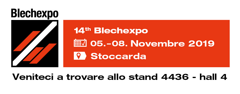 Dal 5 all'8 Novembre saremo presenti per il primo anno al Blechexpo, la fiera internazionale sul mondo della lavorazione della lamiera di Stoccarda. Non perdete l'occasione di venirci a trovare allo stand 4436 del padiglione 4 dove troverete tutte le novità di quest'anno ed il nostro staff pronto ad accogliervi ed a rispondere alle vostre domande.
