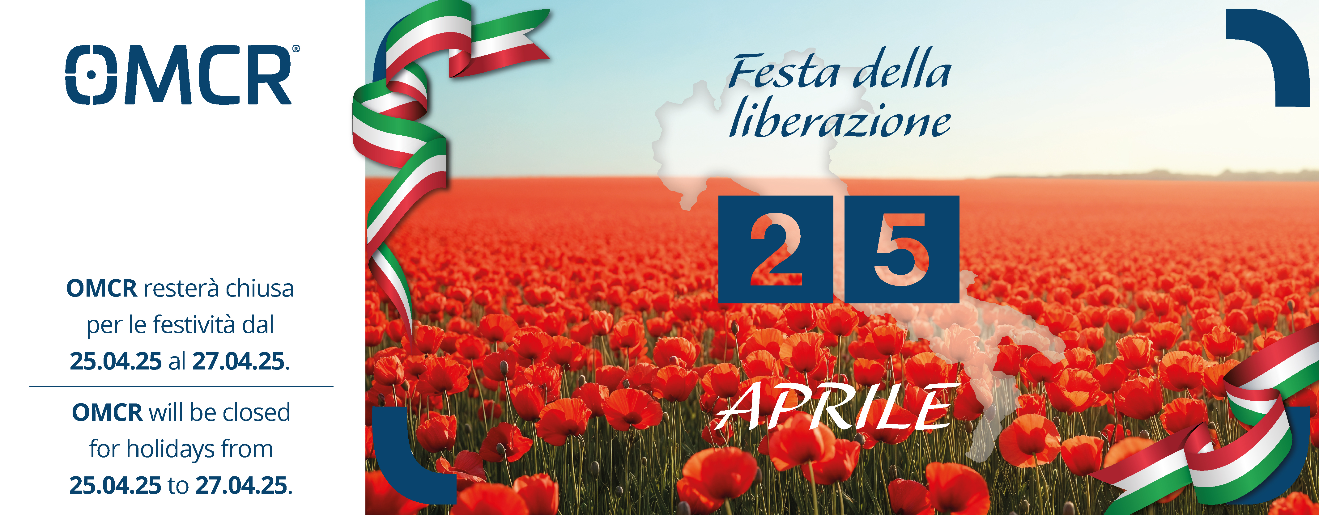 Informiamo clienti, fornitori e partner che OMCR sarà chiusa giovedì 25 aprile in occasione della Festa della Liberazione.